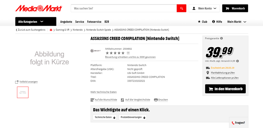 过德国零售商 Media Markt 的网站页面显示,育碧将在任天堂Switch平台,PlayStation 4,和Xbox One推出《刺客信条汇编合集(Assassin’s Creed Compilation)》,甚至还给出了2019年3月29日发售的准确日期。网页显示售价为39.99欧元,但随着发布日期临近和价格可能会发生变化。