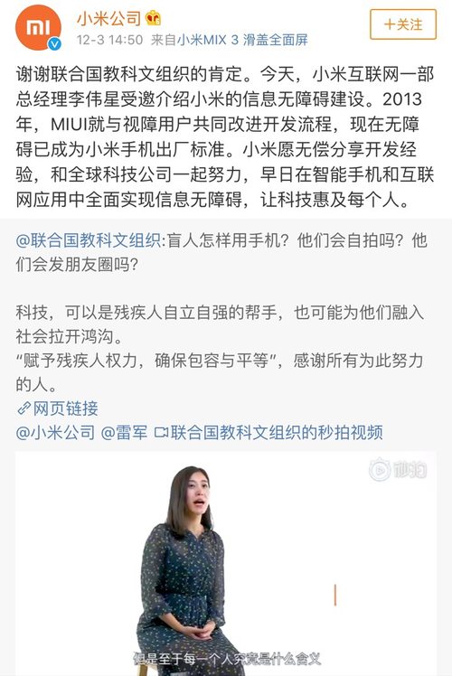 12月3日,联合国教科文组织介绍了小米在信息无障碍建设方面的努力,践行让每一个人都能享受科技的乐趣。