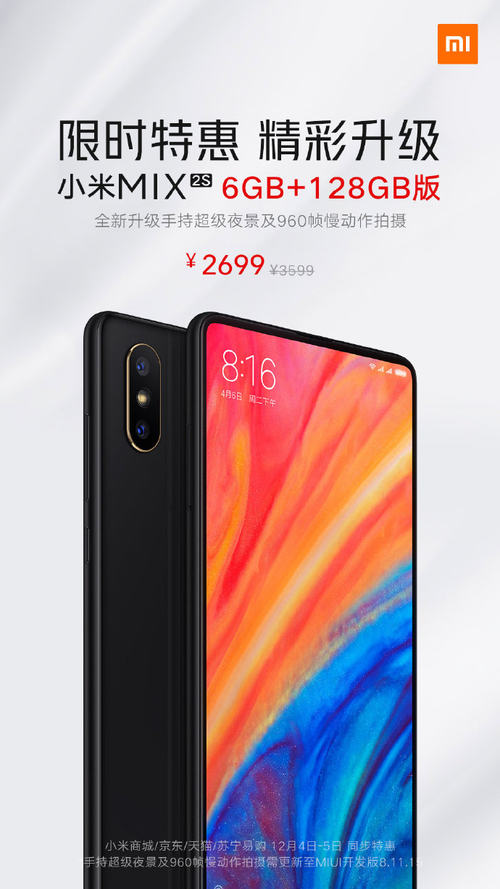 12月4日消息,小米商城官方微博宣布,小米MIX 2S限时特惠,6GB+128GB版本售价2699元。此次降价比起首发价3599元便宜900元,性价比突出。