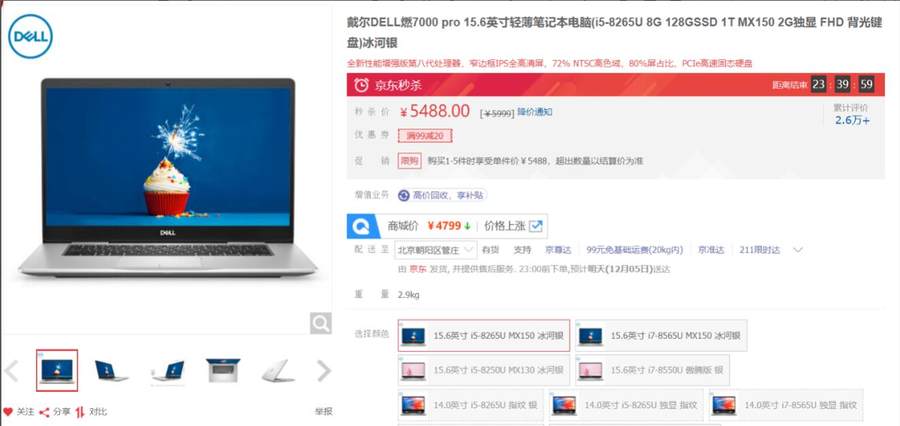 戴尔燃7000 pro 15.6英寸轻薄笔记本电脑冰河银 京东售价5488元