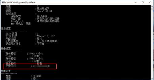 然后按下回车,在显示出来的“安全设置”一栏当中,“关键内容”所显示的,就是该WiFi热点对应的密码了。