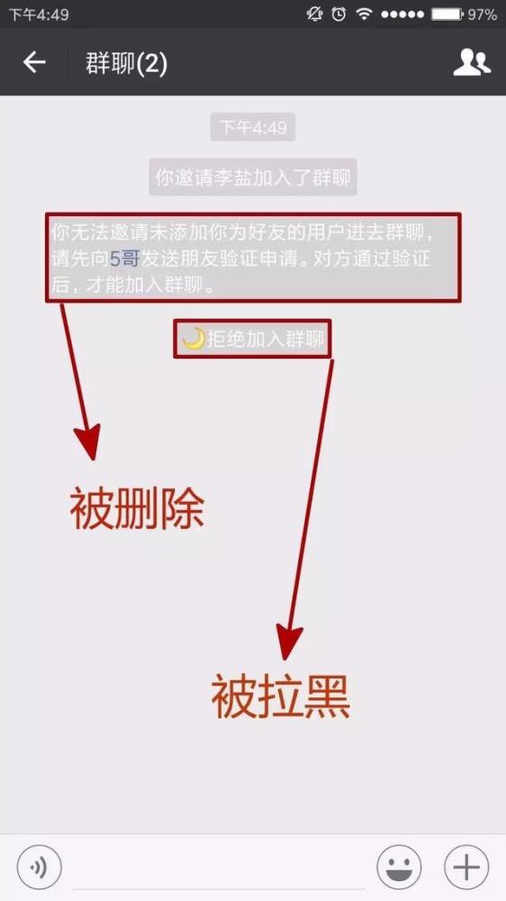 如果好友拉黑了就会显示「拒绝加入」群聊,如果是直接被删除的好友,需要先发送好友申请。