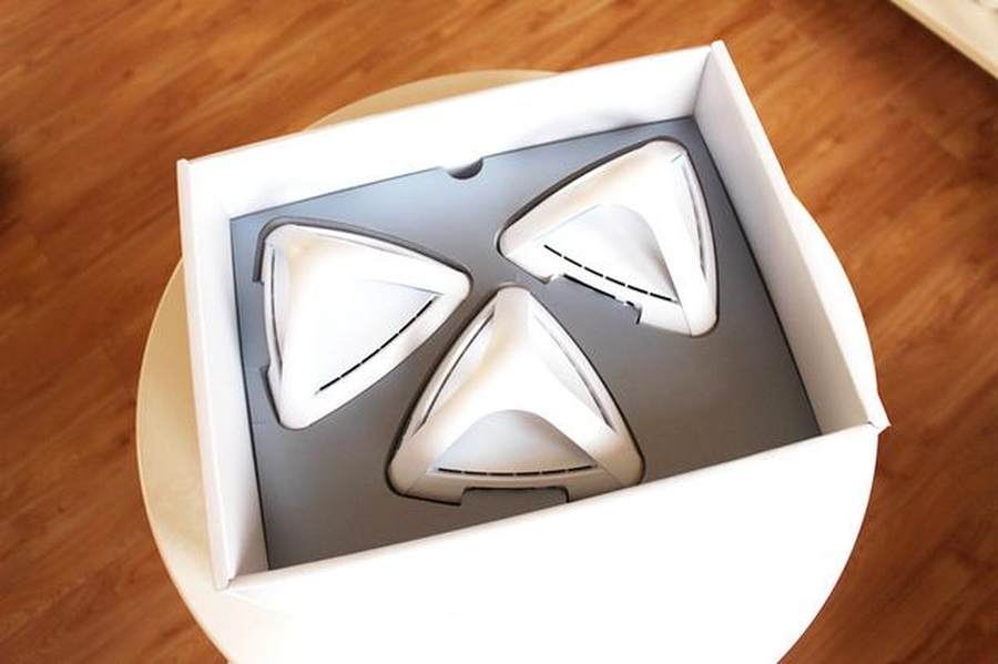 打开盒子,里面错落有致的摆放着三台三角形的路由器,这个造型的路由器可是十分少见。