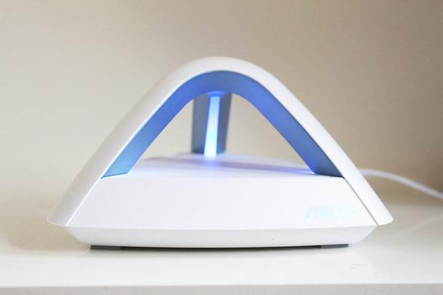 接通电源,“金字塔”路由器内侧的三条LED灯带亮起柔和的蓝光,非常漂亮。