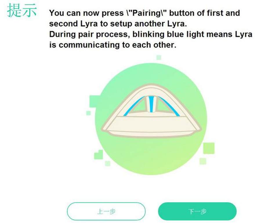 这个向导其实并不是设置路由器的,而是解释如何“配对”Lyra 路由系统的。说实话,这下一步让我有点崩溃,全部都是英文啊,就不能给汉化一下么?不过英文的含义还算简单,这是说在第一次使用时按下底部的“Pairing”键,直到蓝光闪烁,就是成功了,然后可以再设置其它的了。