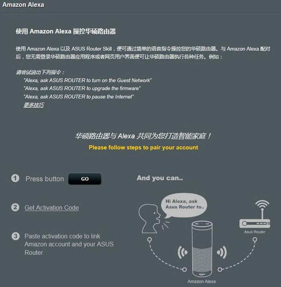 看过了前面各种高大上的功能,华硕还可以有很多特殊的应用,比如与亚马逊的智能音箱连接,通过简单的语音就可以操控华硕路由器,无需再登录路由器。不过这项功能目前只限英文版的亚马逊音箱,我们期待像天猫精灵、小度智能音箱这种更符合国内环境的智能产品能够接入进来,让路由器更加智能。