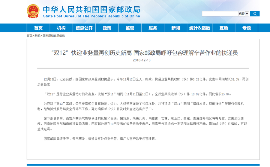 12月13日消息,据国家邮政局监测数据显示,今年双12,邮政、快递企业共揽收快递3.22亿件,比去年同期增长32.5%,再创历史新高。