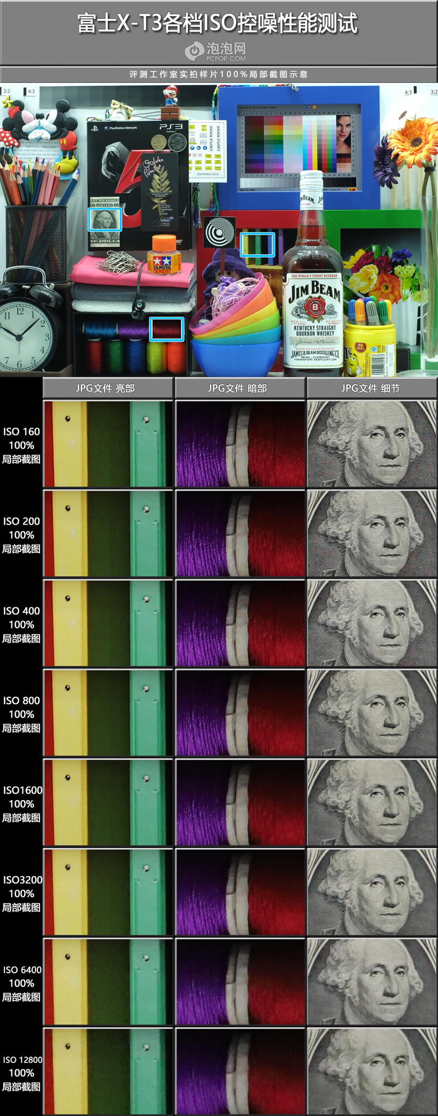 虽然在数字上看似只上升了少许像素,但这对于一款APS-C画幅来说无疑试一次大的突破了。X-T3也是富士X系列中第一次使用背照式CMOS的相机,背照式结构具较佳集光能力,足以抵消像素提升时带来的噪点影响,再加上 X-T3没有低通滤镜,让其解像力进一步提升。所以从什么的对比可以看到,X-T3基本上在ISO 1600内都十分能打,即便是在ISO 3200-6400也并没有明显的噪点出现。