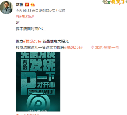 自12月12日起,随着18号联想Z5s发布会的临近,联想手机掌门人常程在微博开启diss小米之旅。今早继triple kill后常掌柜献出quadra kill,四怼小米系列。挑衅的文字“呵 要不要面对面PK...”再搭上微博配图海报“先睹为快 专治发烧 p一下才开心”的说辞,直指小米系统MIUI,火药味十足。据今早新品信息曝光显示,联想Z5s将预装搭载安卓9 Pie系统。