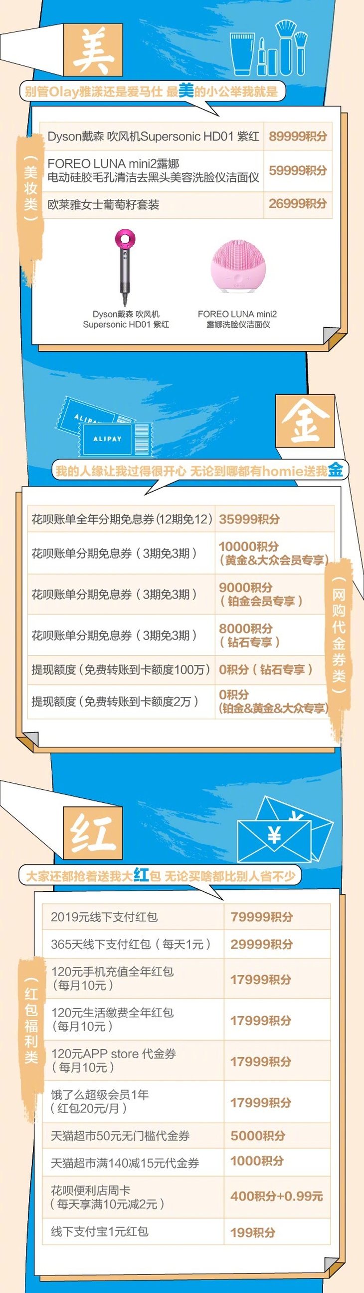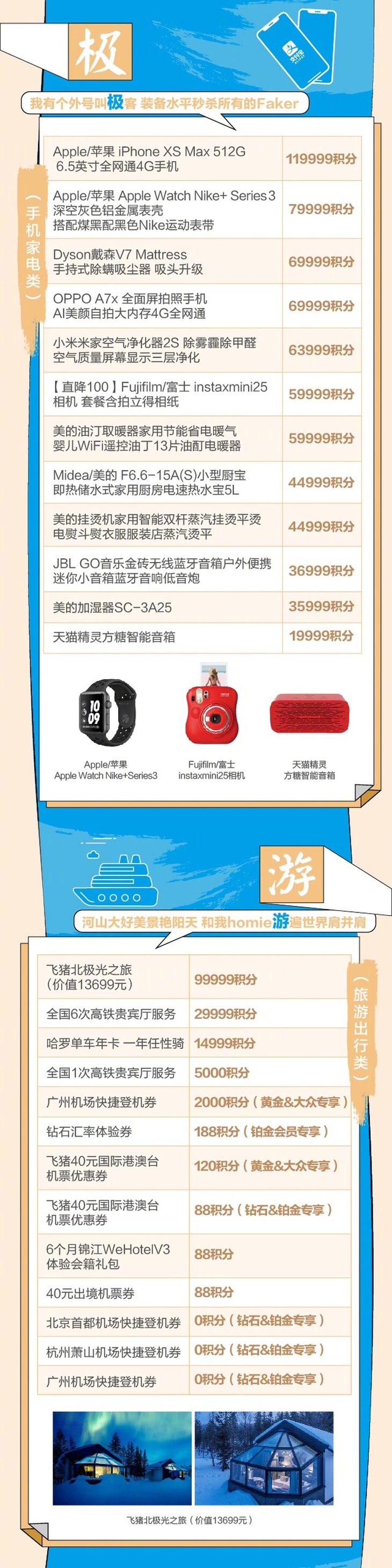 如果用户拥有大量积分,也会兑换精选权益,例如19999元天猫购物红包、iPhone XS Max 512G版、价值13699元的北极之旅等。