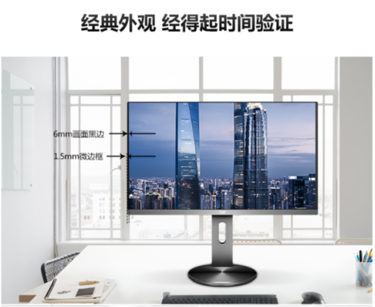 AOC U2790PQU显示器屏幕最下方、显示器支架和底座部分用的是银色,其余部分用的是黑色,黑、银色的结合让显示器看起来更加时尚大气。显示器在屏幕边框上也比较窄,经过实测,左、上、右三边大概只有8mm左右,进一步强化了屏幕本身的表现力。