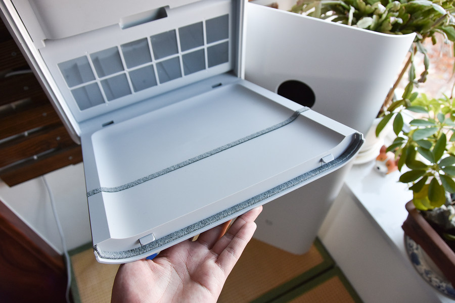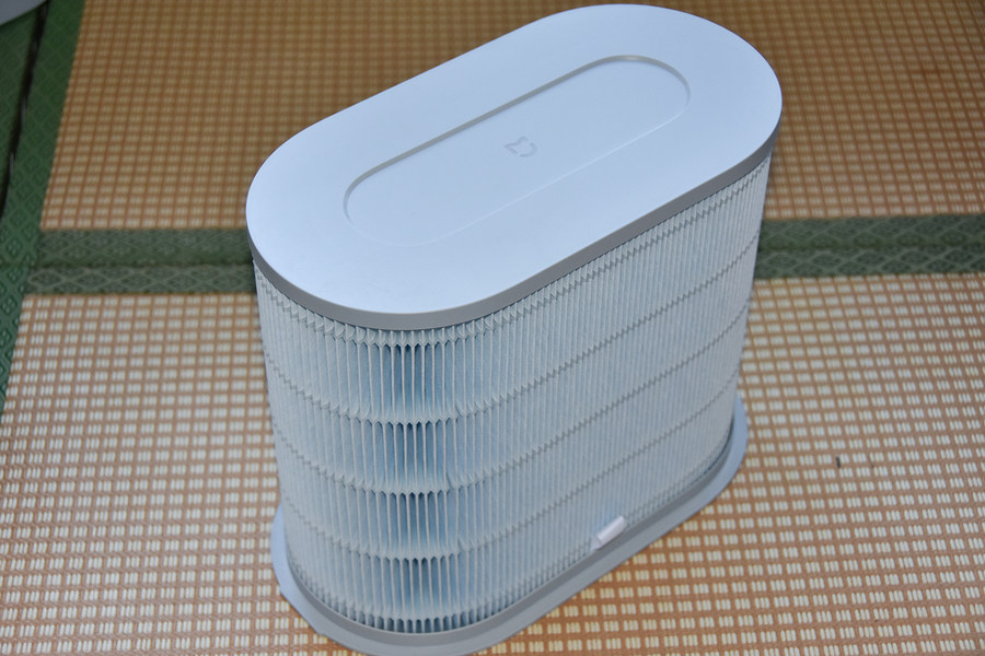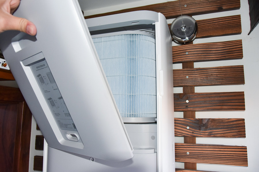 最上面是H13级别的HEPA滤网,它没有采用和中效滤芯一样的抽屉式设计,而是设计成了桶状,这样与空气的接触面更大,同时又能改变风的直线流向,即使开到最高档,出风也不是那么生猛。