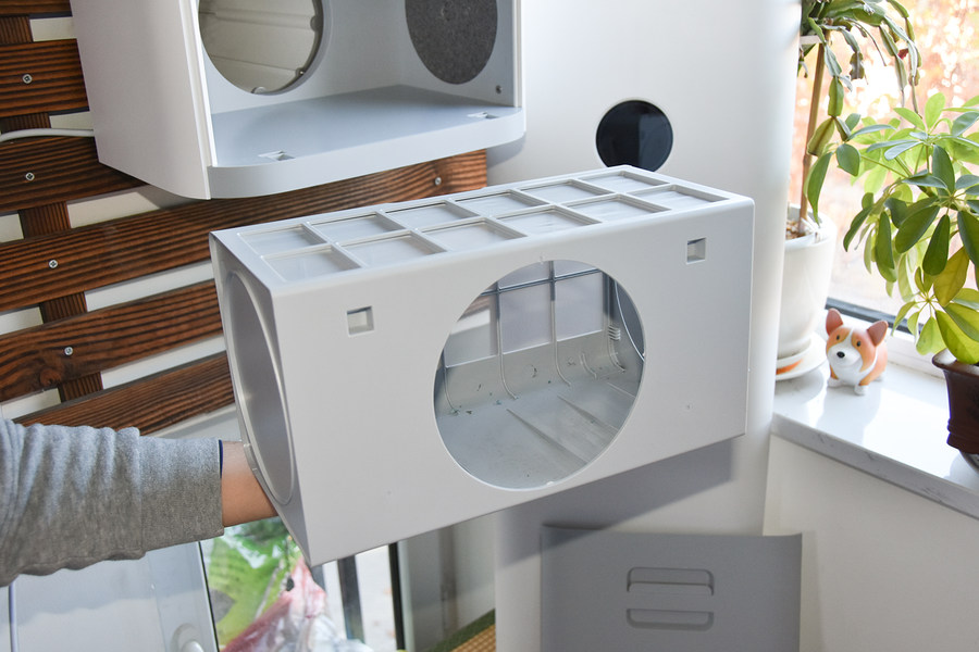初级滤网说它是滤盒更为合适,它的作用是拦截室外的蚊虫、柳絮等,把它设计为盒状不仅使它能容纳的杂物更多,也方便随时拿下来水洗。