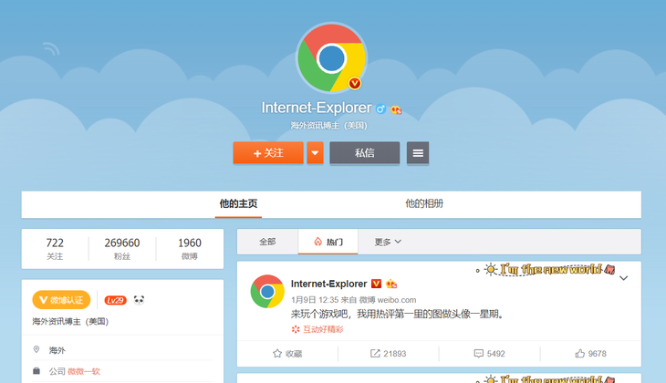 有些网友推荐的头像真是让人为博主捏了一把汗,除了用网络表情包的,最惨的要数@Internet-Explorer了,虽然不是官方微博但是着实被网友”坑“了一把,在他微博下最热的图居然是chrome浏览器。