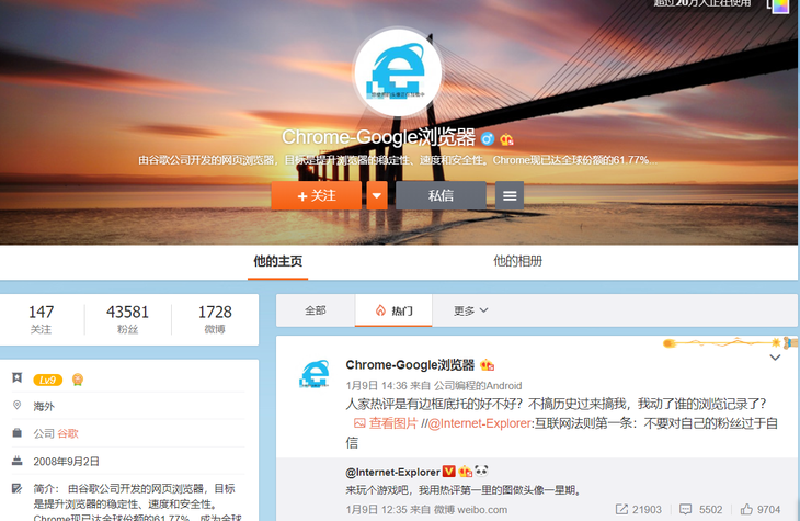 更加有意思的是@Chrome-Google浏览器也将头像换成了IE图标,并在微博上和@Internet-Explorer亲情互动,这样和谐有趣的话题大家都很欢喜的在一旁吃瓜。