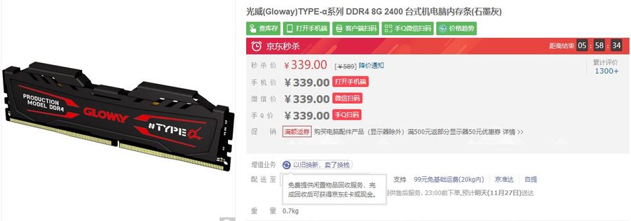光威TYPE- α系列内存目前京东现售价299元,可使用15元全品类券,包邮到手券后价284元。十分实惠,目前2133频率的条子已经售罄,值得有需要的朋友关注一下。