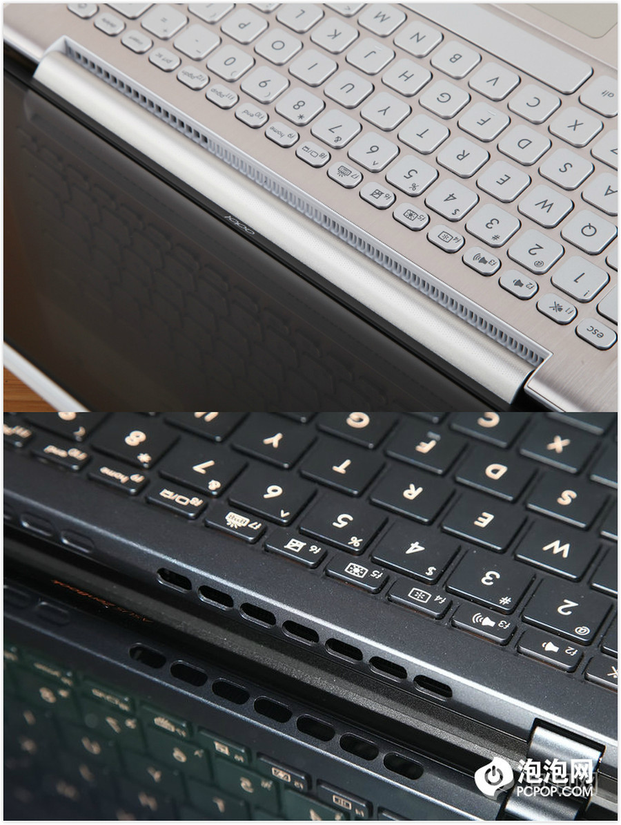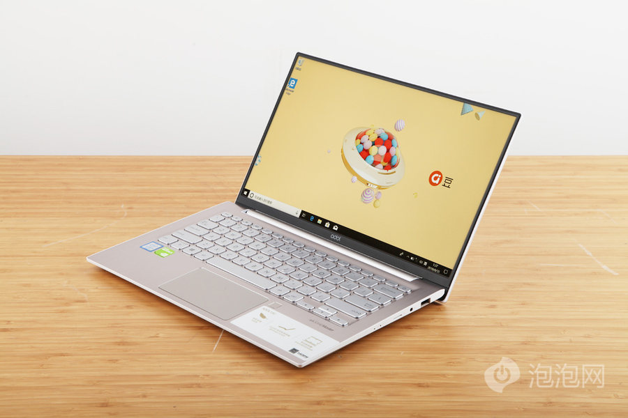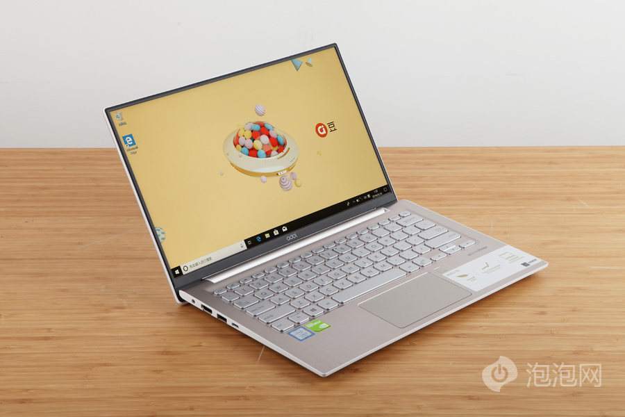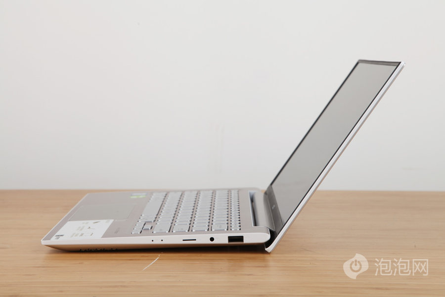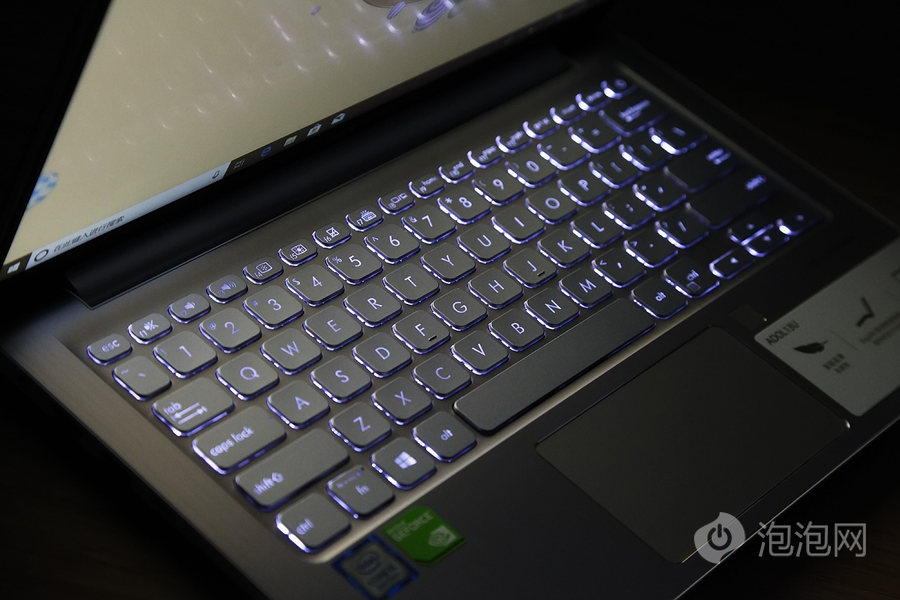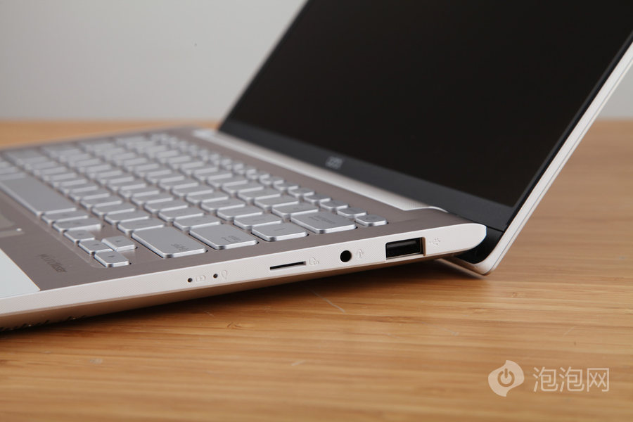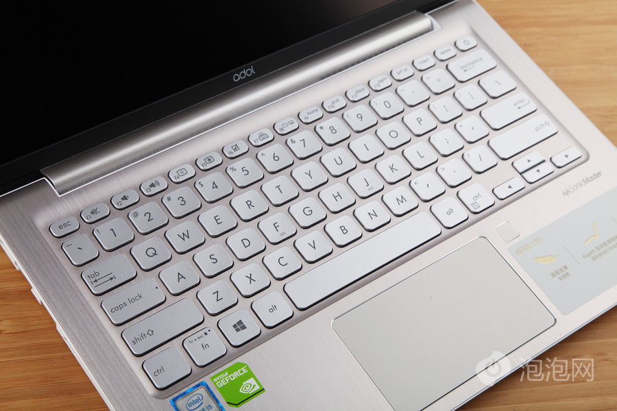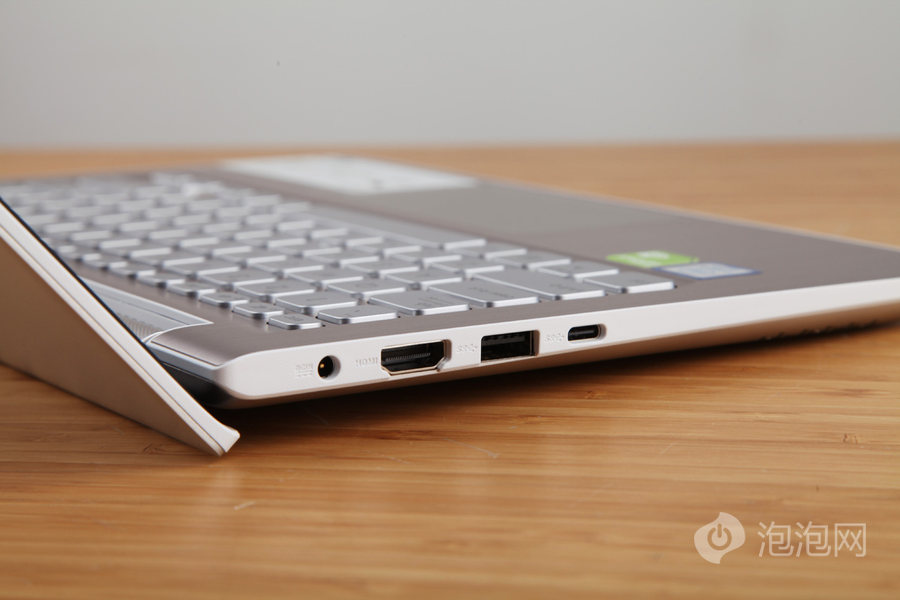 冰钻金配色的笔记本C面采用了金属拉丝的表面设计,有着美观的视觉效果的同时为用户带来了优秀的触觉体验,银色的键盘按键采用1.4mm键程设计,搭配被A面顶起的2.47°的倾斜面,输入体验良好。