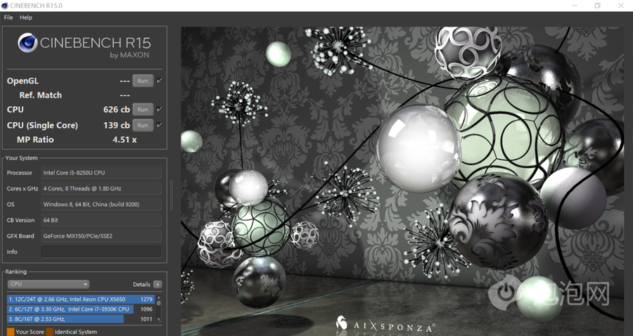 a豆笔记本搭载了一颗酷睿i5-8250U处理器,主频1.6GHz,采用四核心、八线程设计,睿频3.4GHz,设计功耗15W,我们使用 CineBench R15来进行处理器性能测试,多核成绩626cb,单核成绩139cb,总体表现良好。