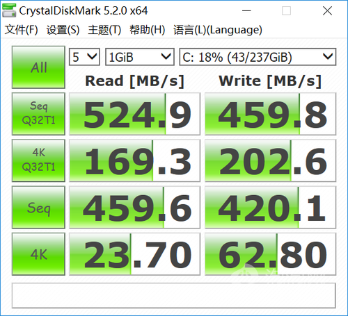 a豆笔记本使用了一块镁光1100固态硬盘,采用SATA协议,连续读取速度达到524.9MB/s,连续写入速度达到459.8MB/s,在SATA硬盘中属于不错的读写成绩,可以满足用户日常存储需求。
