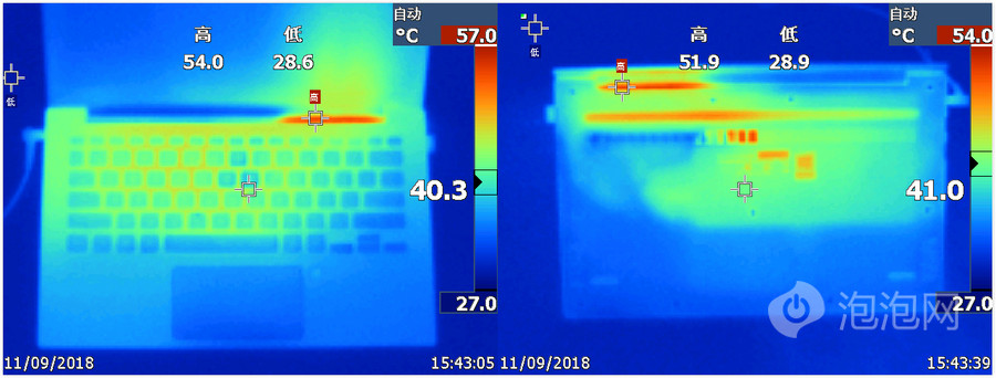 在笔记本C面,基本上热量集中在转轴的偏右侧出风口位置,键盘等D面其他部分基本上没有升温,最高温度54℃;在D面,热量基本上集中在左侧靠上的风扇散热口附近,最高温度51.9℃,使用感受舒适。