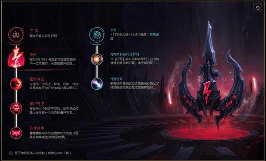 接下来的三四层我们分别点出猛然冲击与灵性猎手。皇子的eq二连可以轻易的触发猛然冲击的额外伤害。副基石天赋我们选择启迪来搭配,可以增加额外的10.5的攻击力。然后下面的一二层我们点出海克斯科技闪现罗网和行近速率。这两个符文的被动都可以帮助皇子增加gank效率。