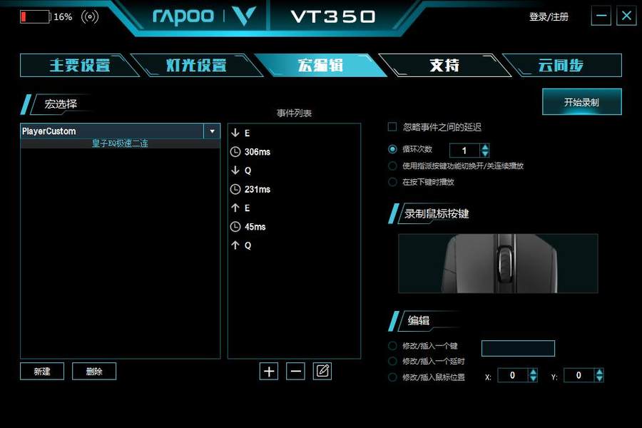 熟悉皇子的基本玩法之后,下面就为大家讲解如何通过雷柏VT350一键玩皇子EQ二连。相信许多的玩家有时候会因为手速不够快而没法发出皇子的EQ二连,我们可以通过宏定义的设置, 将完美解决您的手速问题,让你一键就能发出EQ二连招,让你在游戏中快人一步发出皇子连招,离胜利更进一步。