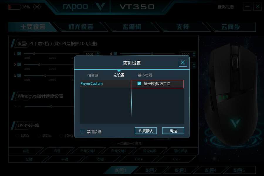 皇子作为这款游戏的热门英雄之一,其强力的控制技能以及高爆发,一直深受各位玩家的欢迎。笔者将使用雷柏VT350电竞游戏鼠标强大的驱动宏定义功能给你玩出一个更加王霸之气的皇子。