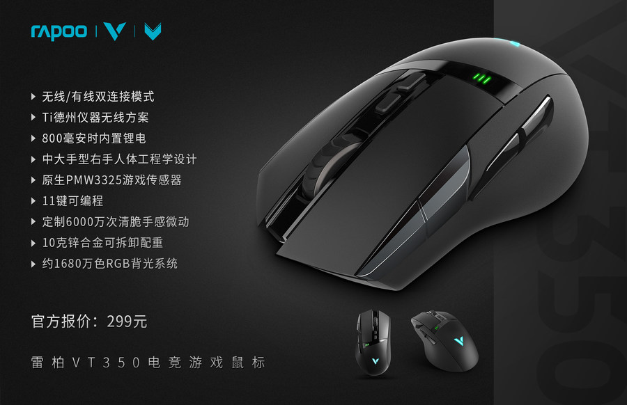 RAPOO雷柏 领军国产外设品牌,实力大厂上市企业发布的VT350电竞游戏鼠标,拥有1680万色区域RGB灯光系统,无线/有线双连接模式,搭载原生PMW3325的专业传感器,可在200-5000DPI中以100DPI为单位的逐级微调,6000万次的清脆手感微动开关,性能和手感得到极大提升;11个可编程按键,化繁为简智慧游戏。配备的1颗10克重的可拆卸配重块,能够适当调整鼠标的重心和重量。板载内存、编织线材、镀金USB接口、特氟龙材质脚垫,优秀的工业设计与表面材质保证了长时间游戏的舒适度。仅售299元,相信它一定会成为你首选的游戏利器,给你畅快的游戏操作体验。